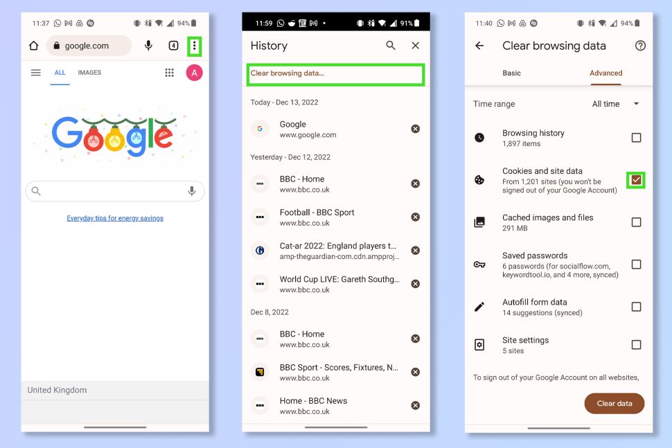 1. On Chrome, tap the three dots in the corner, then tap history. Now tap Clear browsing data.